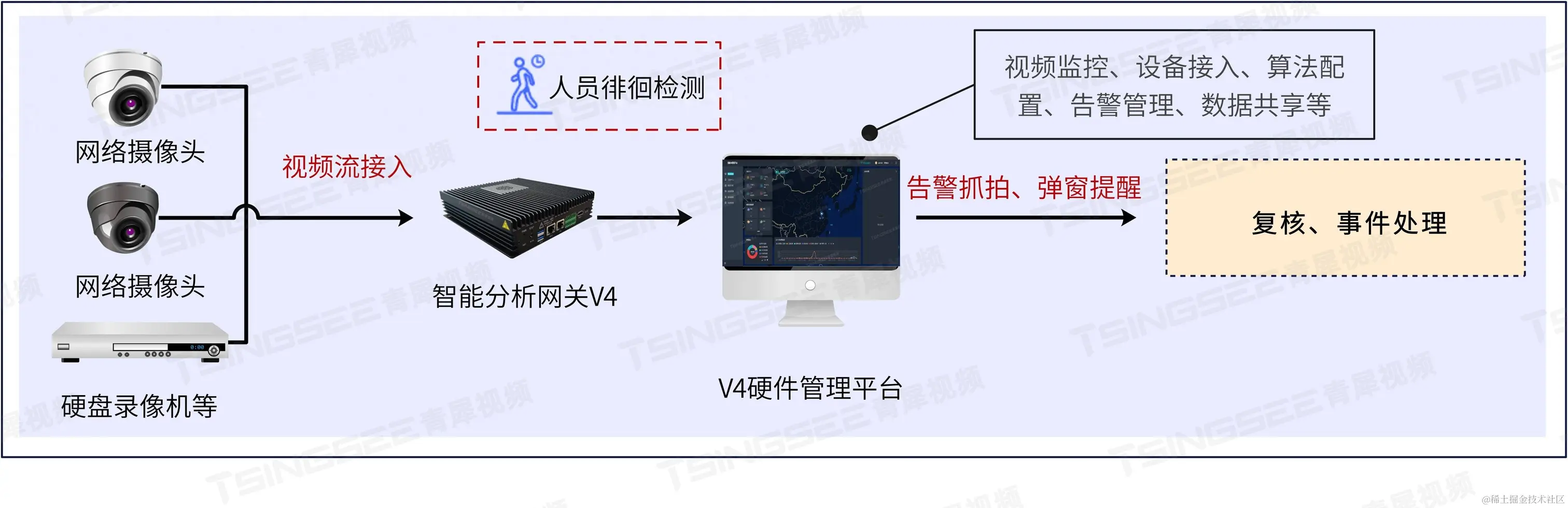 TSINGSEE青犀AI智能分析网关V4内置了近40种AI算法模型,支持对接入的视频图像进行人、车、物、行为、烟火等实时检测分析,上报识别结果,并能进行语音告警播放。硬件管理平台支持RTSP、GB28181协议以及厂家私有协议接入,可兼容市面上常见的厂家品牌设备,可兼容IPC、网络音柱等,同时也支持AI智能摄像头的接入。