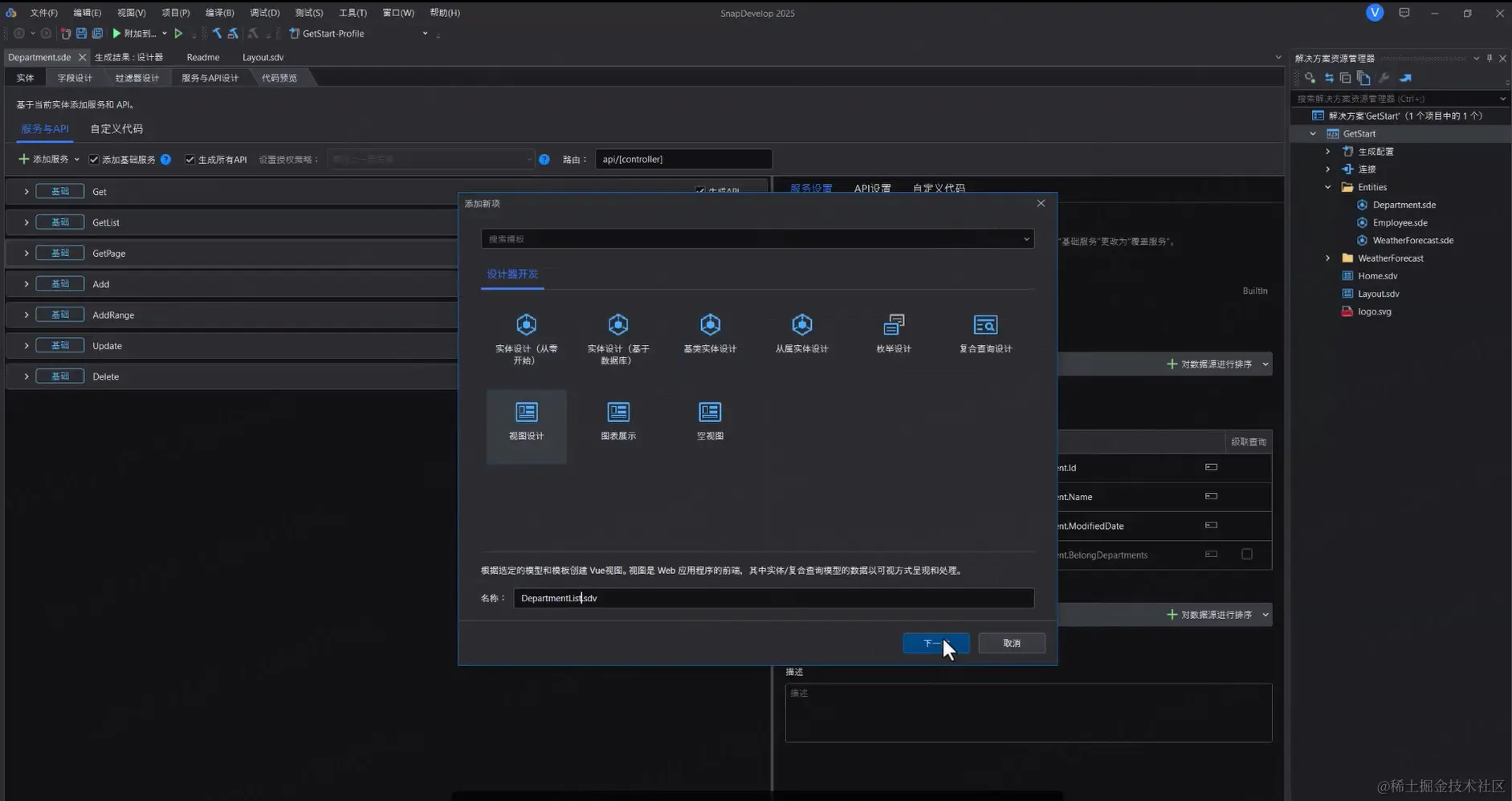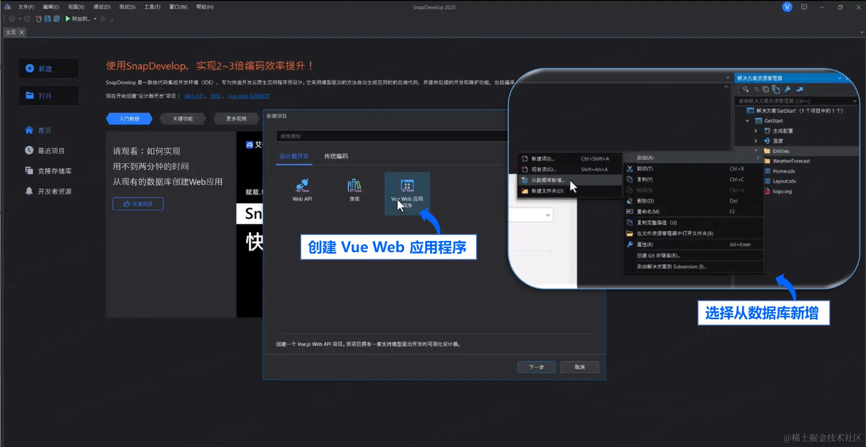 首先,打开 SnapDevelop,选择 新建 > 设计器开发 > Vue Web 应用程序。创建完成后,该项目会显示在右侧解决方案资源管理器中。接下来,从现有数据库中选择对应的表进行实体创建。