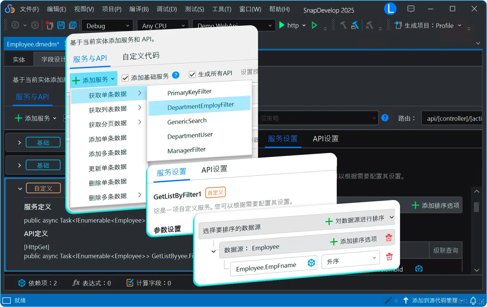 SnapDevelop 支持基于实体创建服务和 API,支持配置返回值的排序规则,支持添加包含过滤条件的服务,支持添加新服务或继承已有的服务。