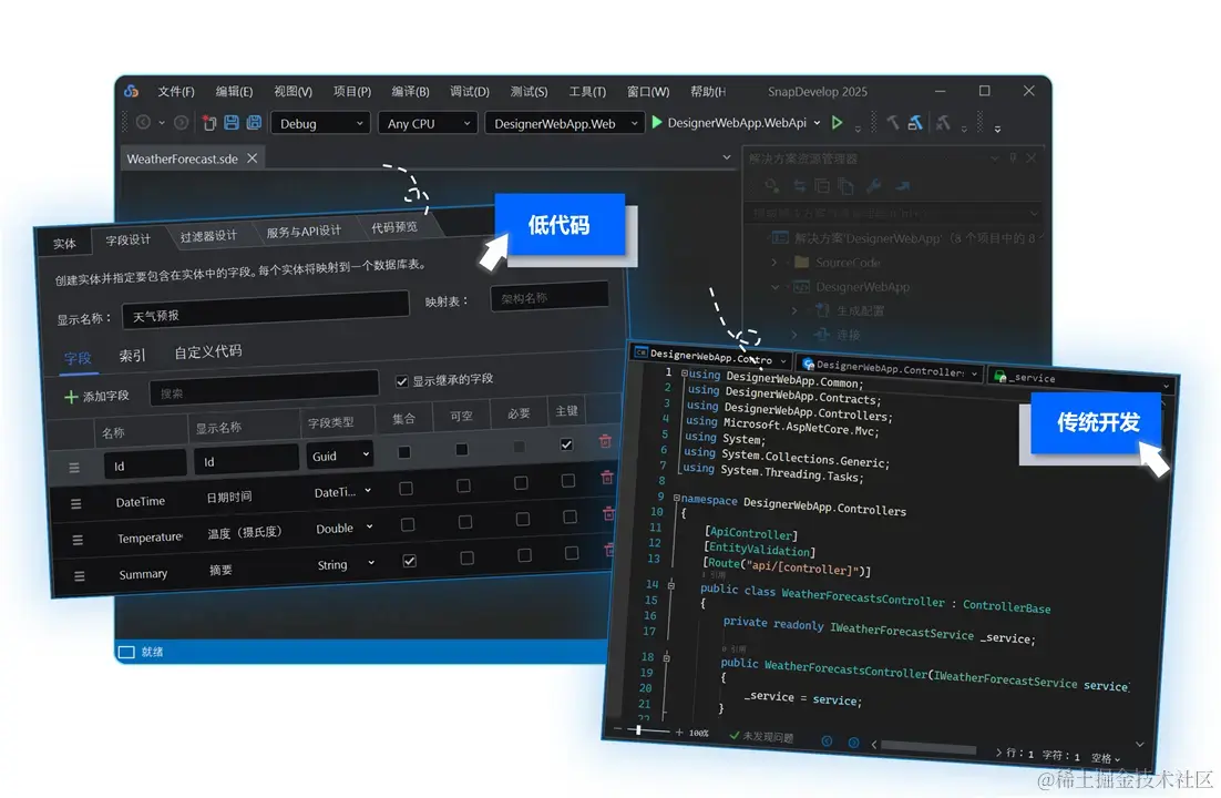 - 开发模式,自由切换: 开发者可以在低代码和传统开发模式之间自由切换,直接扩展生成的代码,实现与传统开发方式的无缝融合。