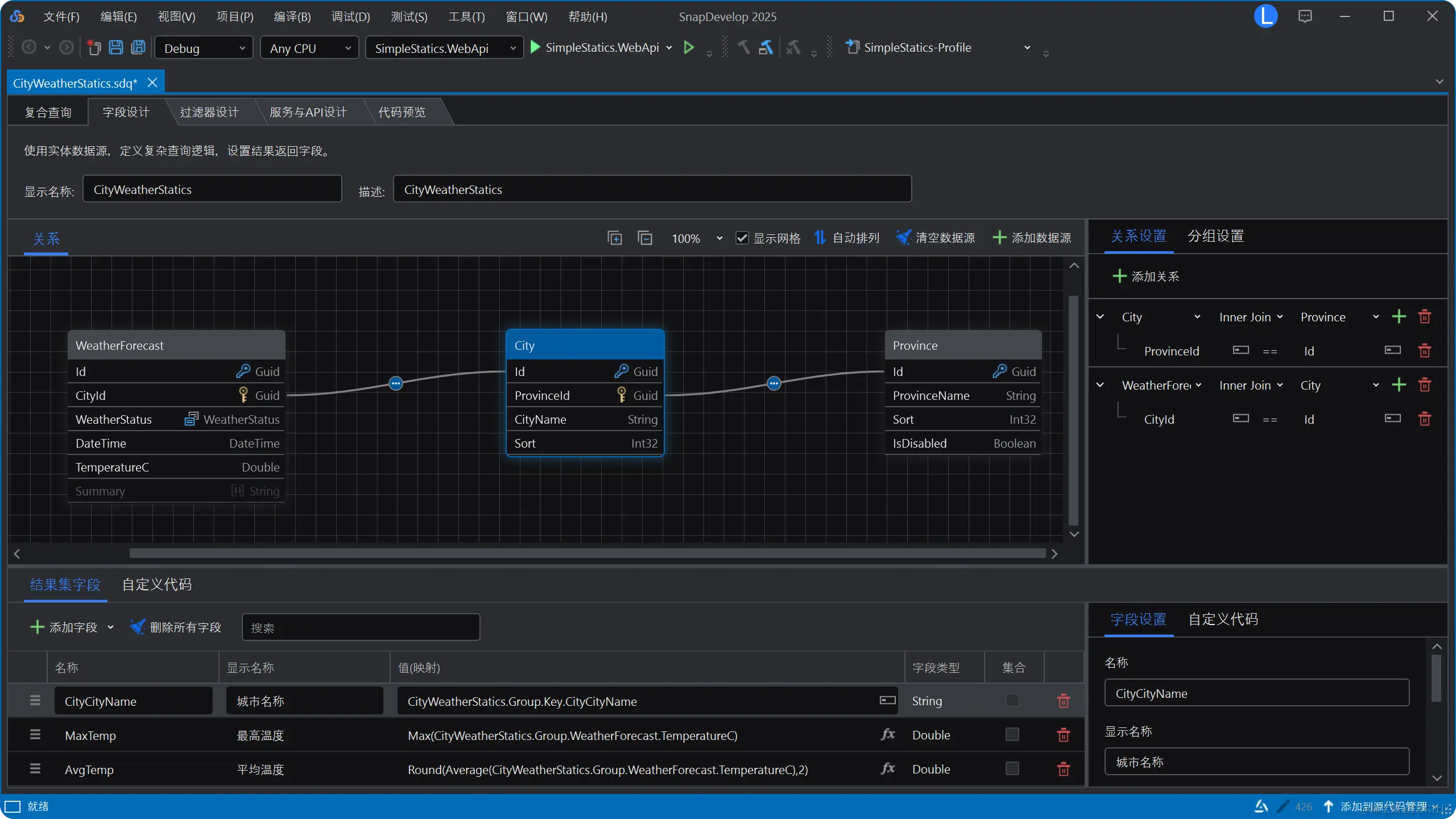 SnapDevelop 支持多表联结,支持创建强大的查询条件,支持可视化构建复杂业务数据的查询,支持对查询结果集进行再运算。