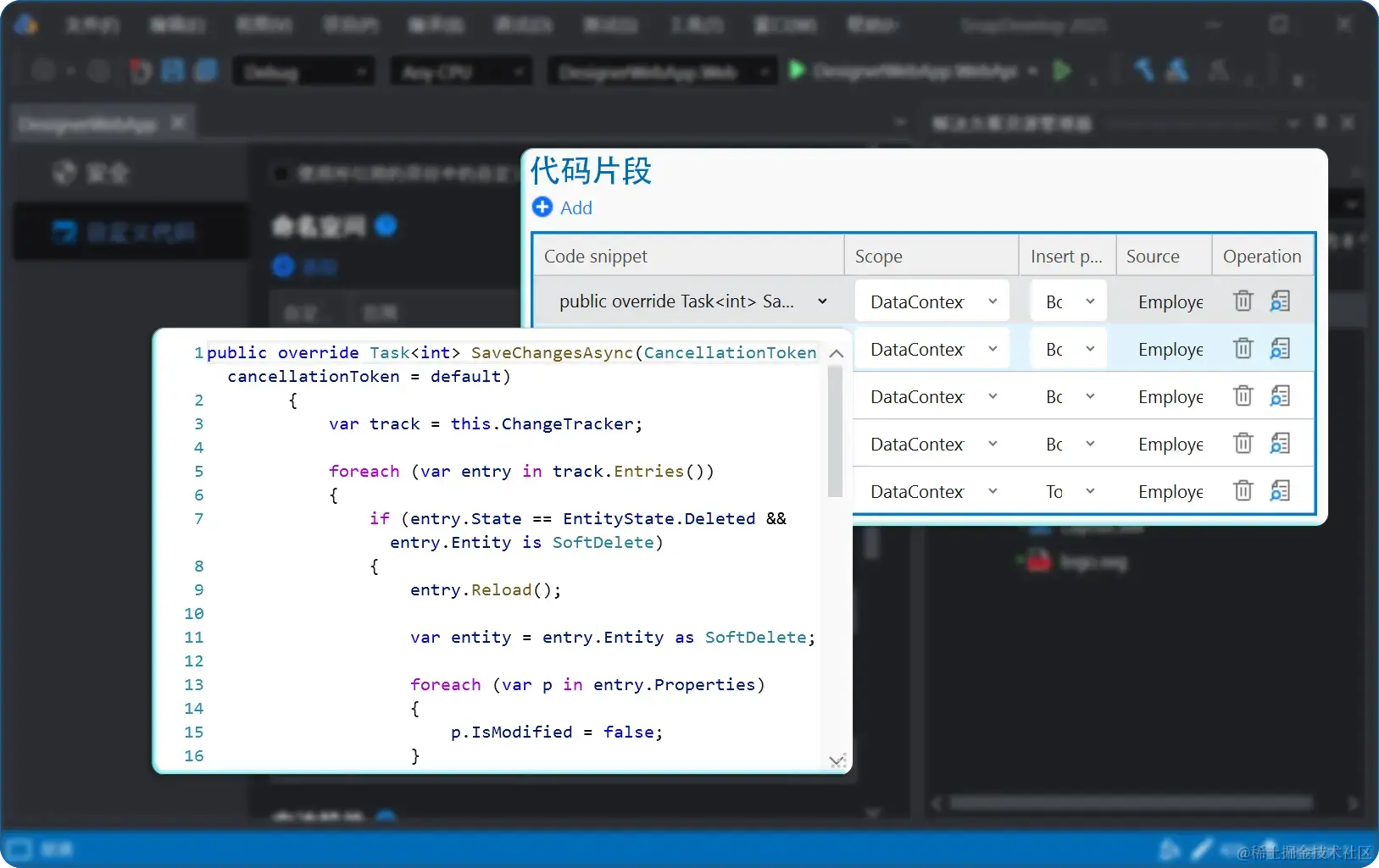 SnapDevelop 会根据所选的表自动生成实体设计器文件,并且默认已添加基本的服务和 API。
