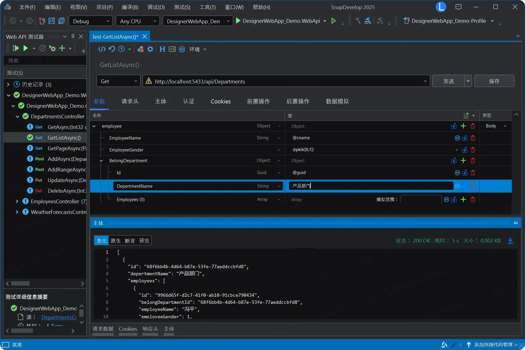 SnapDevelop 集成了可视化 API 测试工具,无需借助第三方工具(如 Postman),即可快速完成 API 的设计与调试。