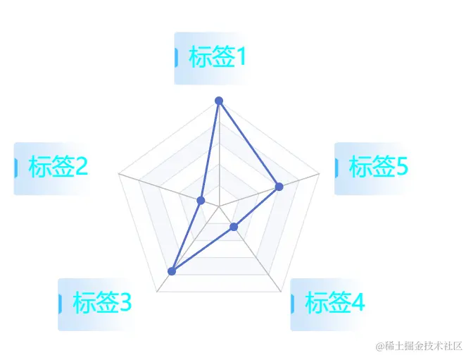 雷达图的标签和其他的ECharts图表不一样的是,它不是由xAxis、yAxis控制,它是通过radar来进行配置。雷达图的标签值写在radar.indicator中。