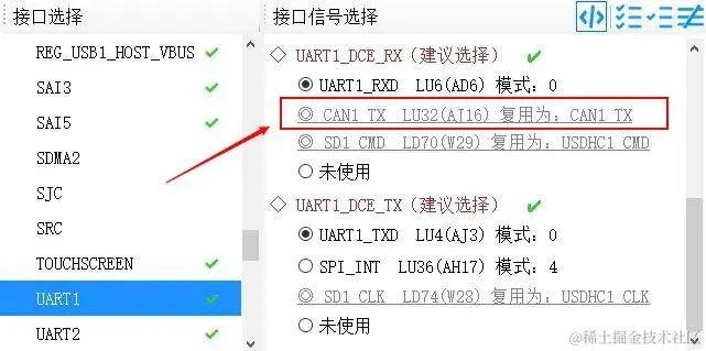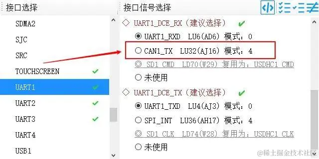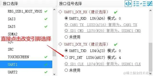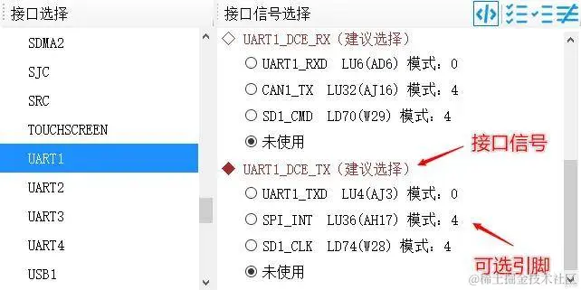 - 在左侧“接口选择”列表中选择不同外设(如UART1),可以在“接口信号选择”和“引脚图”中看到该接口的相关信息。