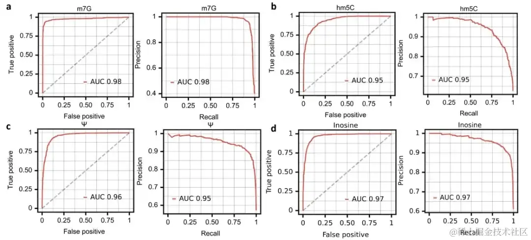 经过 2 个周期,所有模型都达到了高准确度, hm⁵C、m⁷G、Ψ 和 I 的 ROC-AUC 分别达到了 0.98、0.95、0.96 和 0.97。如上图 a、b、c、d 所示。