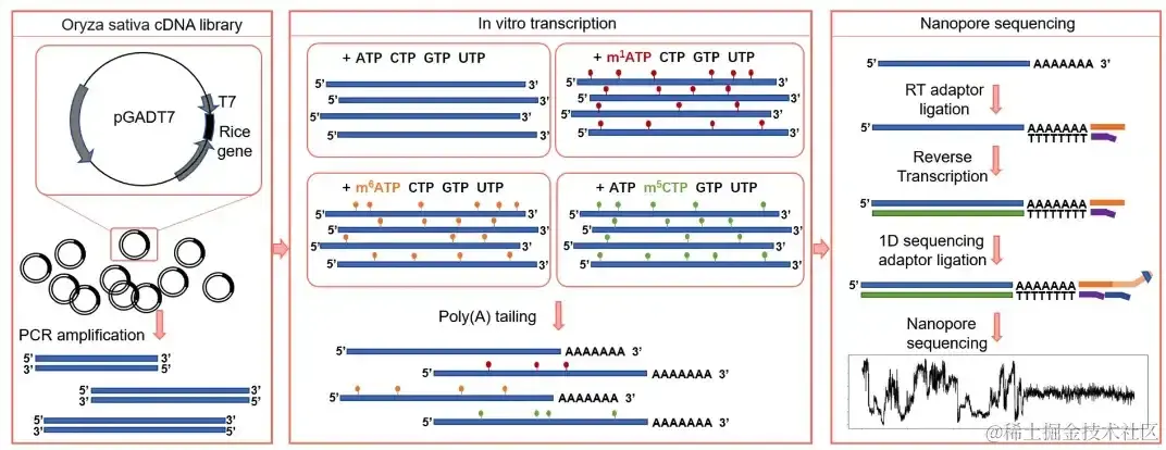 利用水稻cDNA文库体外转录带有m¹A、m⁶A、m⁵C标签的转录本、并通过DRS创建体外表观转录组的示意图