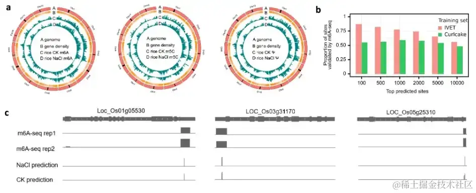 同时,为解决体外合成序列转录的 RNA 无法覆盖自然序列全部范围的问题,研究团队对含有 T7 启动子的水稻 cDNA 文库进行体外转录,得到了具备不同修饰标签的数千个转录本,加 polyA 尾后通过 DRS 构建了 4 个训练集 (m¹A、m⁶A、m⁵C 和未修饰碱基),称为体外表观转录组数据集 (IVET)。