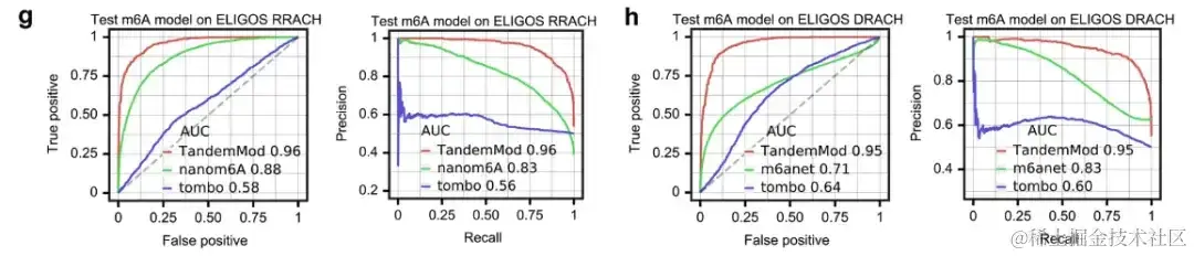 此外,研究团队还将 TandemMod m⁶A 模型与 tombo、nanom6A 和 m6Anet进行了比较,如上图所示。