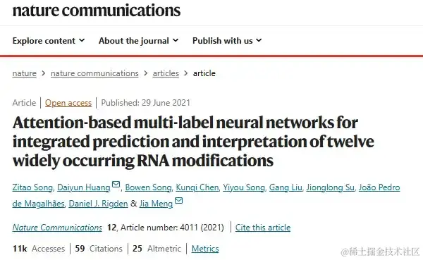 例如,在 2021 年,西交利物浦大学孟佳教授团队在「Nature Communications」期刊上发表了题为「Attention-based multi-label neural networks for integratedprediction and interpretation of twelve widely occurring RNA modifications」的文章。