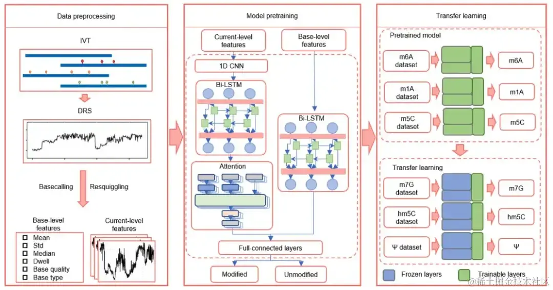 以此为基础,研究团队以每 5 个碱基分配到的电信号及其统计特征作为输入,训练可同时检测多种 RNA 修饰类型的迁移学习模型 TandemMod。