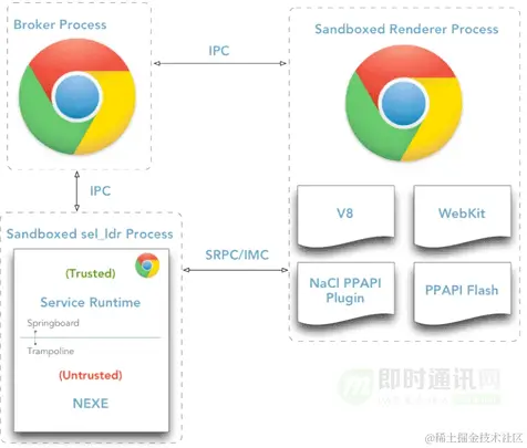 PPAPI 组件可以通过平台动态库的形式(Windows 下为 dll 文件,Linux 下是 so 文件, Mac 下是 dyllib 文件)由浏览器直接加载,比如内置的 Flash 组件、Pdf组件,或者通过指定命令行参数 --register-pepper-plugins 来加载,比如:chrome --register-pepper-plugins="D:\\ppapi\\ppapi_example_gles2.dll;application/x-ppapi-example-gles2" D:\\ppapi\\gles2.html。可信的 PPAPI 组件以平台动态库的形式存在,所以一般 Chrome 沙箱内允许的 API(比如 CreateThread)都可以调用。