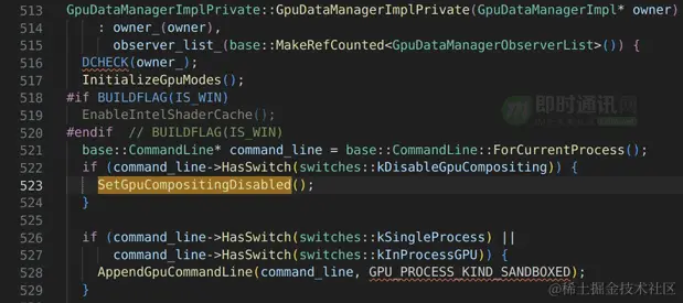 可以看到 gpu_data_manager_impl_private.cc 里面的实现,在 IsGpuCompositingDisabledS 时加了这个 disable-gpu-compositing。