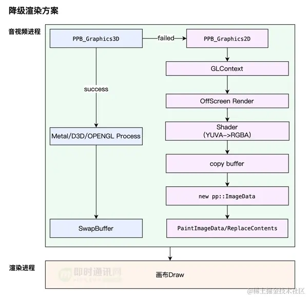 - 1) 音视频进程增加独立 OpenGL 上下文,新增离屏渲染流程,绘制后,复制出 rgba 数据给到 PPB_Graphics2D 上下文;