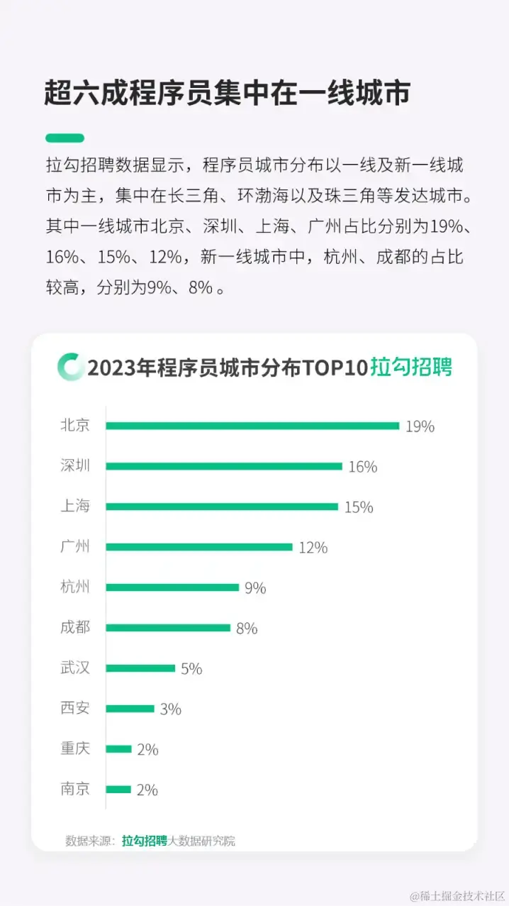 根据拉勾招聘大数据研究院的数据显示,超六成程序员集中在一线城市,其中北京19%,深圳16%,上海15%,广州12%,可以说北上广深就是程序员的天选之地。