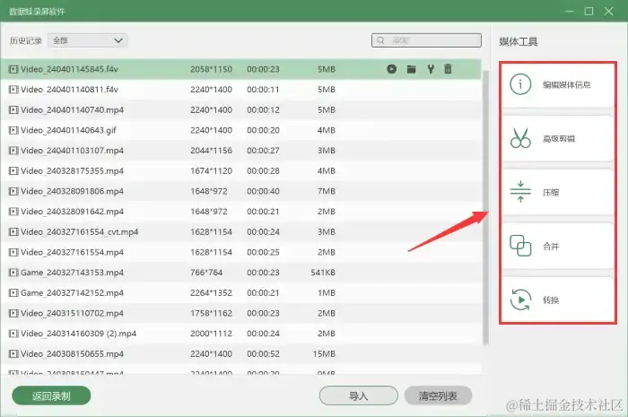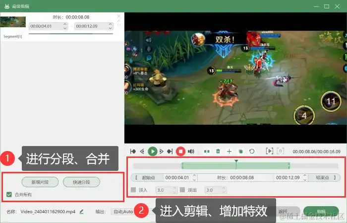 步骤4:录制结束后,可以在 【高级剪辑】 页面对视频进行剪辑、增加特效等编辑,点击 【完成】 后,可以在 【录制历史】 页面对录屏文件进行后期处理,例如对视频进行压缩、合并、格式转换等,让您的游戏视频能够更好地分享于他人,或者将游戏上传到多个不同的平台。