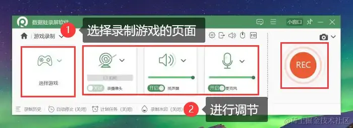 步骤3:选择好要进行游戏录制的页面,调节好摄像头、麦克风等。点击 【REC】 按钮即可进入游戏录屏,录制不限时长。