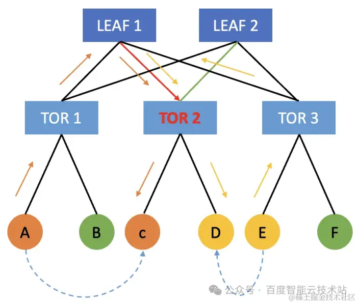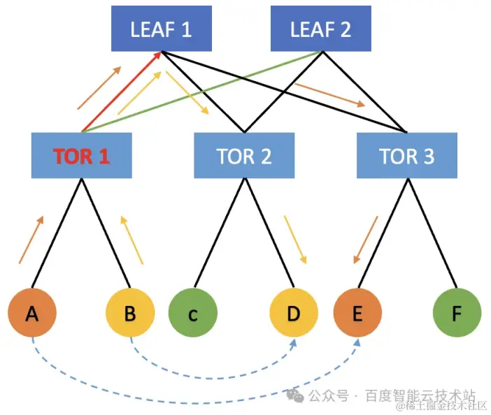 机器 A 如果要向机器 C 发送数据,同时机器 E 要向机器 D 发送数据。在哈希过程中,如果 A 机器走了 TOR 1 -> LEAF 1-> TOR 2 -> C 的链路 ,而机器 E 走了 TOR 3 -> LEAF 1 -> TOR 2 -> D 的链路,那么也会导致这两条流出现下行冲突,也会导致网络流量减半,让端到端的集合通信的性能下降。