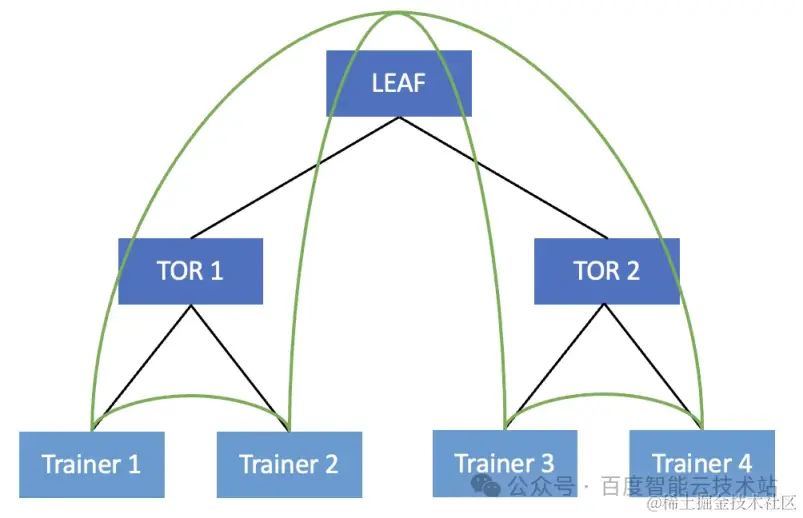 为了解决该问题,我们可以采用一种很简单的方式。在组建通信组的时候,让 Trainer 1 和 Trainer 2,Trainer 3 和 Trainer 4 在同一个 TOR 下,做为相邻的 Trainer。