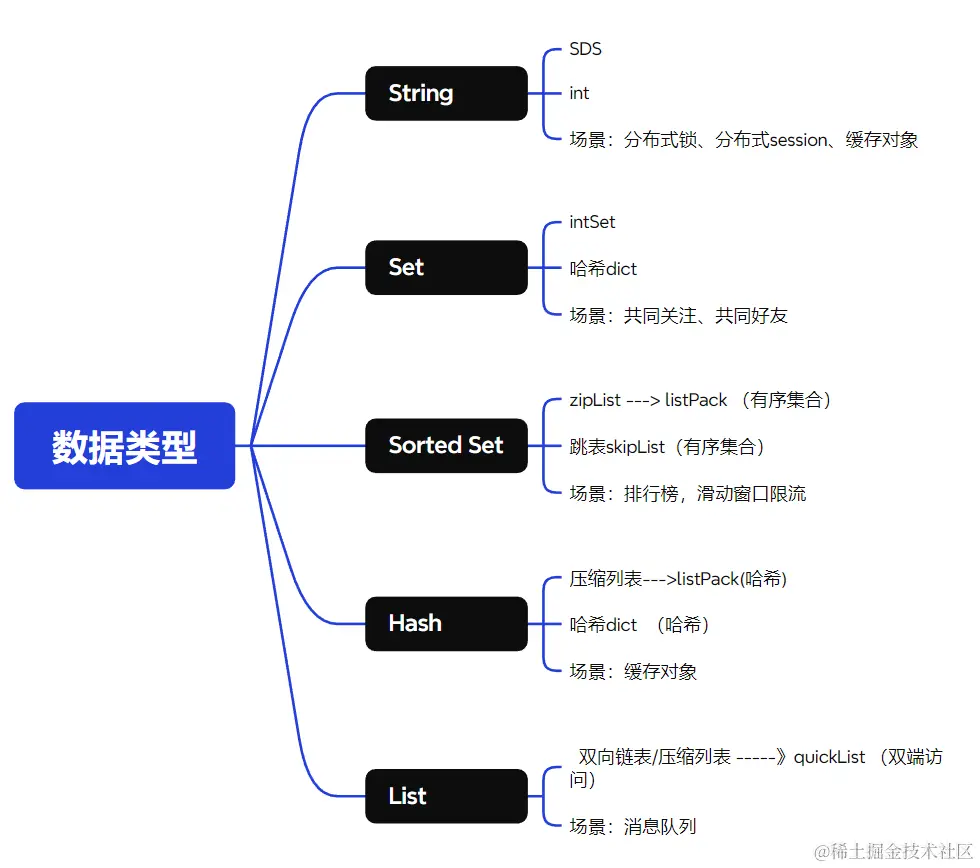 String:分布式锁、缓存对象、缓存sessionList:消息队列(但是有缺陷)Hash:缓存对象 、缓存购物车()Set无序集合:(并交差集的场景)共同好友,共同关注。还有抽奖(随机获取其中的元素)Zset(sorted set):排行榜,接口限流 等