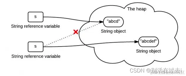 如上图,在堆中重新创建了一个"abcdef"字符串,和"abcd"并不是同一个对象。