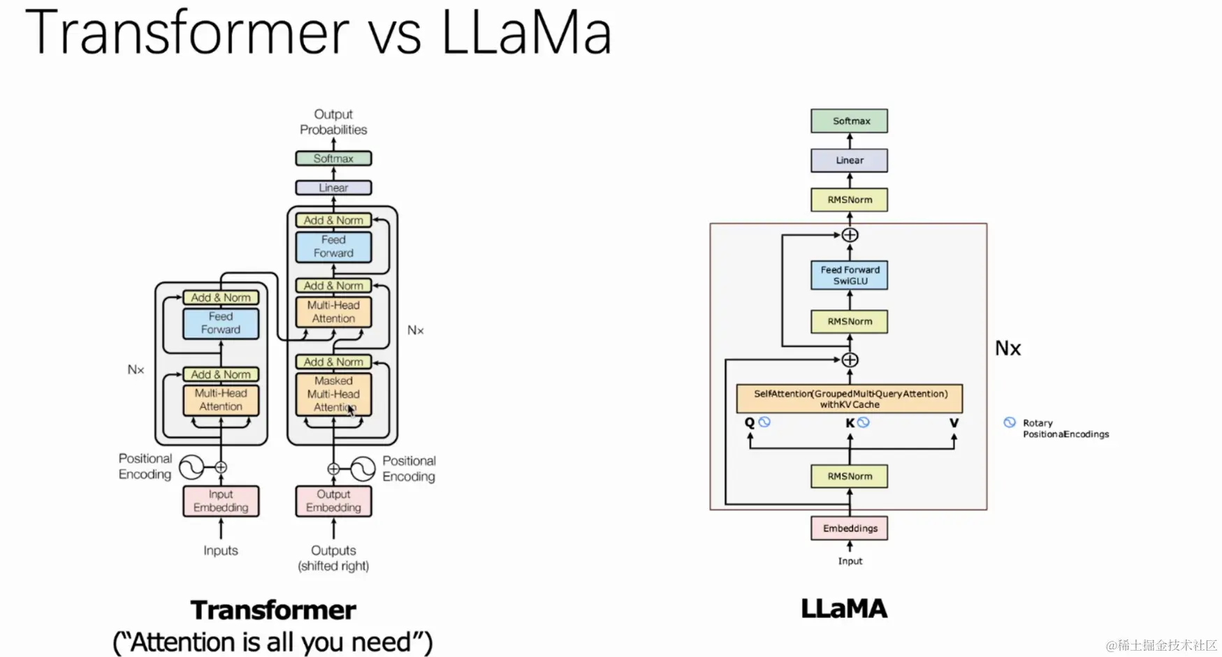 Transformer模型是一种基于自注意力机制的神经网络模型,旨在处理序列数据,特别是在自然语言处理领域得到了广泛应用。Transformer模型的核心是自注意力机制(Self-Attention Mechanism),它允许模型关注序列中每个元素之间的关系。这种机制通过计算注意力权重来为序列中的每个位置分配权重,然后将加权的位置向量作为输出。模型结构上,Transformer由一个编码器堆栈和一个解码器堆栈组成,它们都由多个编码器和解码器组成。编码器主要由多头自注意力(Multi-Head Self-Attention)和前馈神经网络组成,而解码器在此基础上加入了编码器-解码器注意力模块。Transformer与LLaMA 的模型结构对比如下: