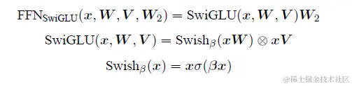 SwiGLU 激活函数是Shazeer 在文献中提出,并在PaLM等模中进行了广泛应用,并且取得了不错的效果,相较于ReLU 函数在大部分评测中都有不少提升。在LLaMA 中全连接层使用带有SwiGLU 激活函数的FFN(Position-wise Feed-Forward Network)的计算公式如下: