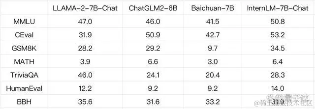 在众多国内开源模型之中,百川智能发布的Baichuan-7B、清华大学和智谱AI发布的ChatGLM2-6B、上海人工智能实验室发布的InternLM-7B等优秀模型广受业界关注。下表列出了这几个7B量级模型在几个有代表性评测集上的表现: