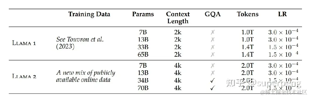 相比于 LLaMA 1 ,LLaMA 2 的训练数据多了 40%,上下文长度也翻倍,并采用了分组查询注意力机制。具体来说,Llama 2预训练模型是在2 万亿的 token上训练的,精调 Chat 模型是在100 万人类标记数据上训练的,具体对比分析如下:
