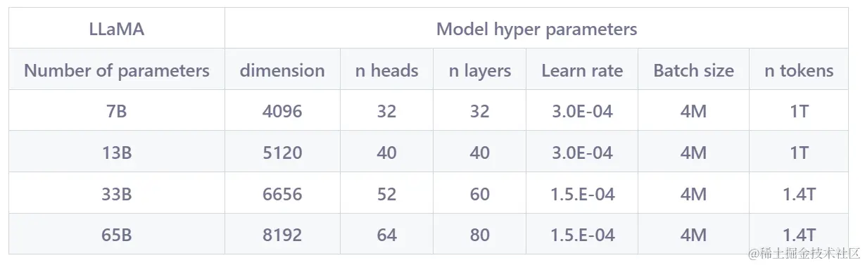 LLaMA 由 Meta AI 公司2022年发布的一个开放且高效的大型基础语言模型,共有 7B、13B、33B、65B(650 亿)四种版本。其数据集来源都是公开数据集,无任何定制数据集,整个训练数据集在 token 化之后大约包含 1.4T 的 token。LLaMA 的性能非常优异:具有 130 亿参数Llama 模型「在大多数基准上」可以胜过 GPT-3( 参数量达 1750 亿),而且可以在单块 V100 GPU 上运行;而最大的 650 亿参数的 LLaMA 模型可以媲美谷歌的 Chinchilla-70B 和 PaLM-540B,LLaMA 模型参数如下:
