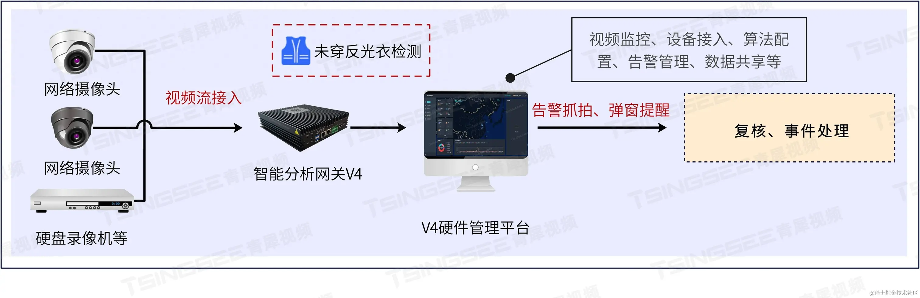 TSINGSEE青犀AI智能分析网关V4内置了近40种AI算法模型,支持对接入的视频图像进行人、车、物、行为、烟火等实时检测分析,上报识别结果,并能进行语音告警播放。硬件管理平台支持RTSP、GB28181协议以及厂家私有协议接入,可兼容市面上常见的厂家品牌设备,可兼容IPC、网络音柱等,同时也支持AI智能摄像头的接入。
