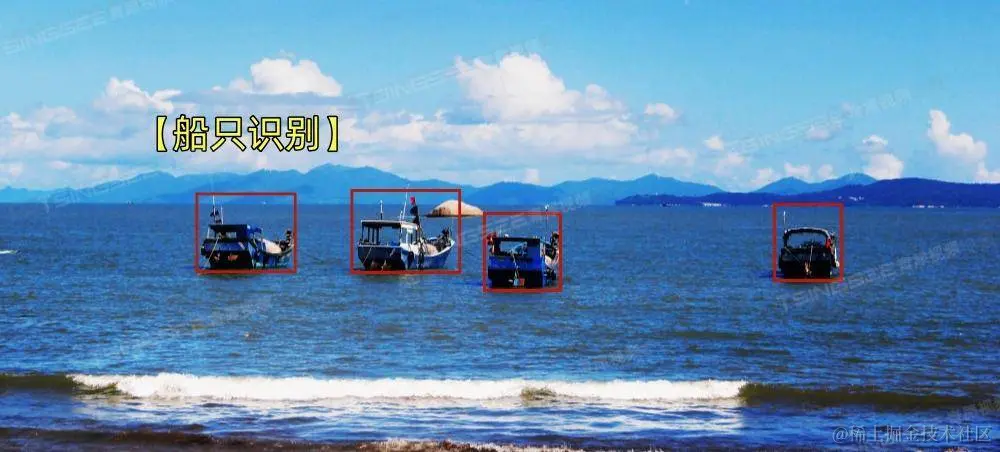 - 船只检测:智能AI算法平台可识别停靠或行驶在河道、湖面、海洋的各种常见类型的船只(捕捞船、挖沙船、货运船、载客船等), 如有捕鱼船进入管辖区域,也会发出告警,还能对区域内船只数量进行统计。