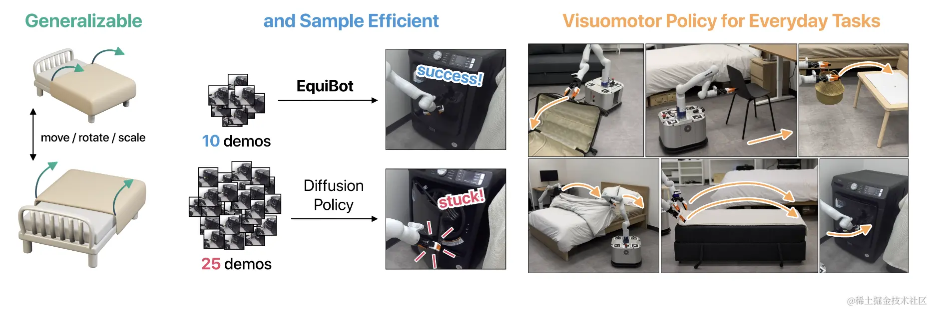 ◇ 想要一个通过观察你来学习家务的机器人吗?EquiBot 是一种✨通用且🚰数据高效的视觉运动策略学习方法,即使仅从 5 分钟的人类视频中,它也能适应物体形状、光线和场景构成的变化 🔗 News