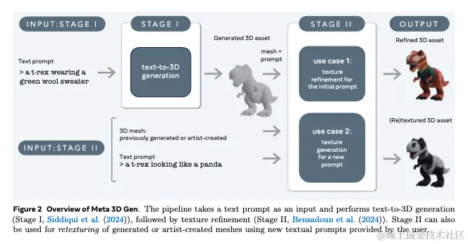 Meta 推出了 Meta 3D Gen (3DGen)。3DGen 可在不到一分钟的时间内提供高保真度和高质量 3D 形状和纹理的 3D 资产创建。它支持基于物理的渲染 (PBR),这是在实际应用中重新点亮 3D 资产所必需的。此外,3DGen 还支持使用用户提供的额外文本输入对先前生成的(或艺术家创建的)3D 形状进行生成性重新纹理化。3DGen 集成了我们分别为文本到 3D 和文本到纹理生成开发的关键技术组件 Meta 3D AssetGen 和 Meta 3D TextureGen。通过结合它们的优势,3DGen 可以同时以三种方式表示 3D 对象:在视图空间、体积空间和 UV(或纹理)空间中。相对于单阶段模型,这两种技术的集成实现了 68% 的成功率。Meta 将 3DGen 与众多行业基线进行了比较,并表明它在复杂文本提示的提示保真度和视觉质量方面优于它们,同时速度明显更快。