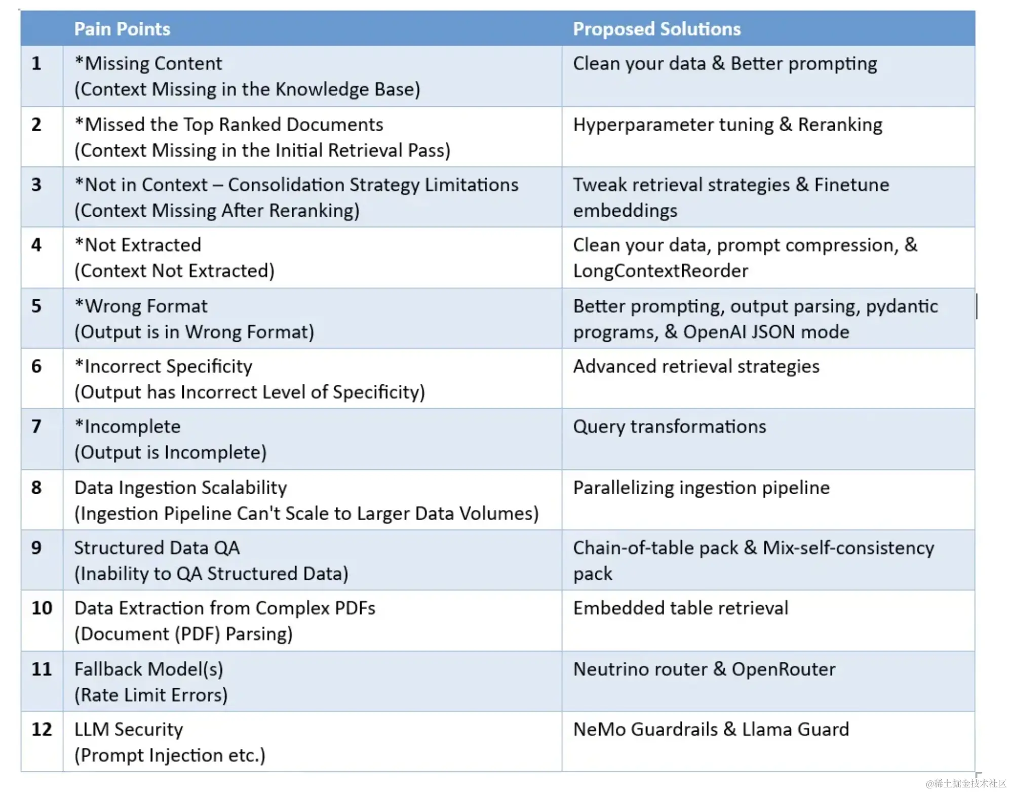 本文主要讨论了检索增强式生成(RAG)的12个痛点及解决方案。RAG能提升内容准确性、缓解幻觉问题等,但存在一些痛点,如内容缺失、错过排名靠前的文档、格式错误等。针对这些痛点,提出了相应的解决办法,包括清洁数据、更好的提词设计、超参数微调、重新排名、调整检索策略、对嵌入进行微调、使用prompt压缩和LongContextReorder、输出解析、使用高级检索策略、查询变换、并行化摄取工作流程、使用特定软件包处理结构化数据问答、从复杂PDF提取数据、设置后备模型以及保障LLM安全等。通过这些解决方案,可以提高RAG系统的性能和可靠性,使其更好地满足用户的需求。总的来说,解决这些痛点对于充分发挥RAG的优势至关重要。