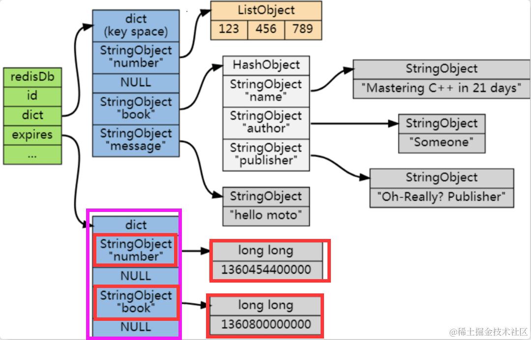 Redis 通过一个叫做过期字典(可以看作是 hash 表)来保存数据过期的时间。过期字典的键指向 Redis 数据库中的某个 key(键) ,过期字典的值是一个 long long 类型的整数,这个整数保存了 key 所指向的数据库键的过期时间