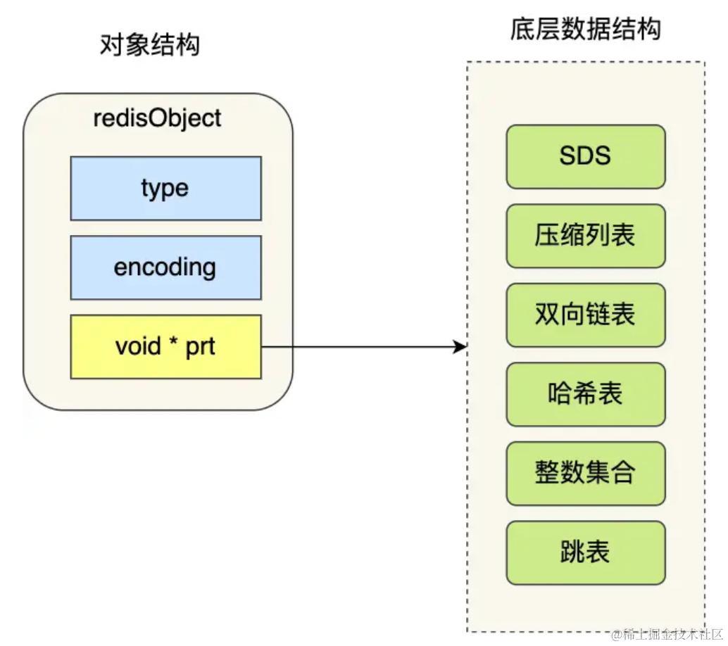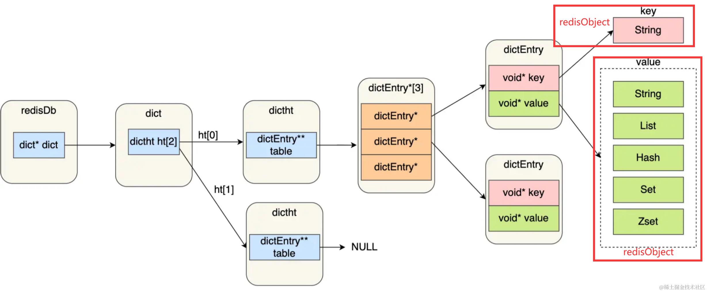 redis中所有数据由redisDB结构体组成,redisDB中有一个指针指向全局哈希字典,这个全局哈希字典中保存了redis的所有键值对。哈希字典由entry数组构成,每个键值对又是一个dictEntry,dictEntry分别有key和value,key和value都指向一个redisObject,然后redisObject根据类型和编码才指向具体的底层数据结构。