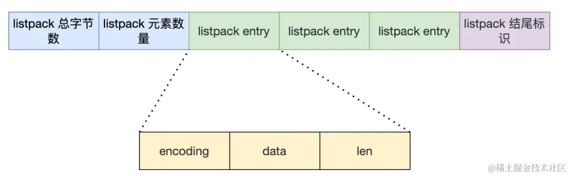 可以看到,listpack 没有压缩列表中记录前一个节点长度的字段了,listpack 只记录当前节点的长度,当我们向 listpack 加入一个新元素的时候,不会影响其他节点的长度字段的变化,从而避免了压缩列表的连锁更新问题。