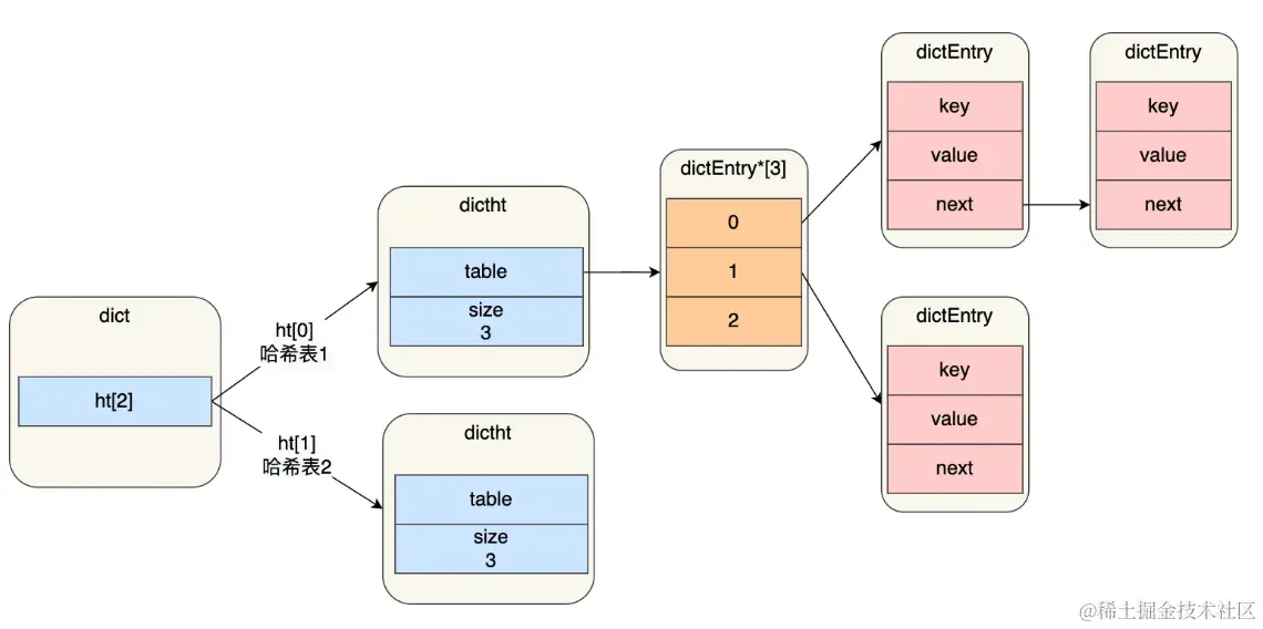 比如,查找一个 key 的值的话,先会在「哈希表 1」 里面进行查找,如果没找到,就会继续到哈希表 2 里面进行找到。