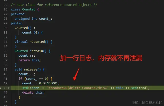 为什么引用计数会出错,是析构函数没有调用,还是其他原因?GDB 定位到具体位置: