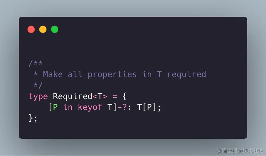 keyof T获取类型T的所有属性名。[P in keyof T]是一个映射类型,它遍历T的所有属性名。T[P]获取属性名P对应的属性类型。-?移除可选属性修饰符?,将属性变为必选属性。