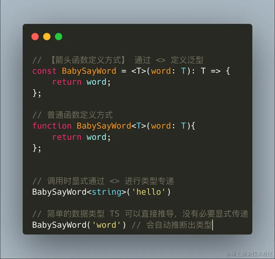 在函数中使用泛型,常用于约束函数参数的类型。需要注意的是函数参数的泛型定义和调用都是定义在函数参数列表的括号前