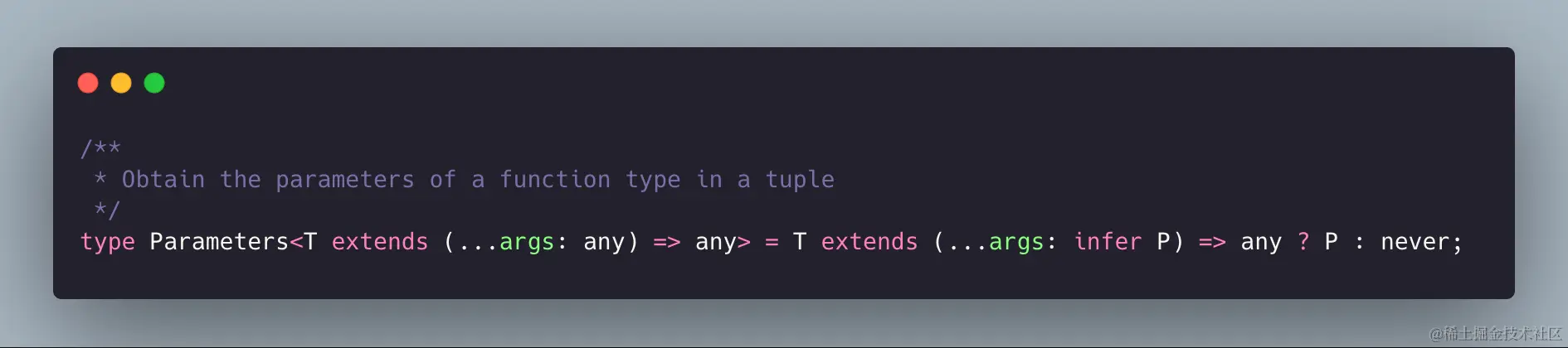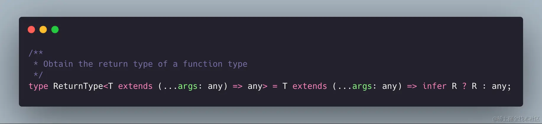 在这个示例中,ReturnType 是一个条件类型,它检查类型 T 是否符合函数类型 (...args: any[]) => infer R。如果 T 是一个函数类型,TypeScript 会推断出函数的返回类型 R。