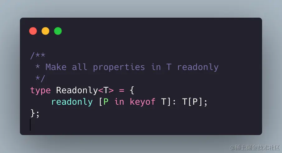 keyof T获取类型T的所有属性名。[P in keyof T]是一个映射类型,它遍历T的所有属性名。T[P]获取属性名P对应的属性类型。readonly将属性变为只读属性。