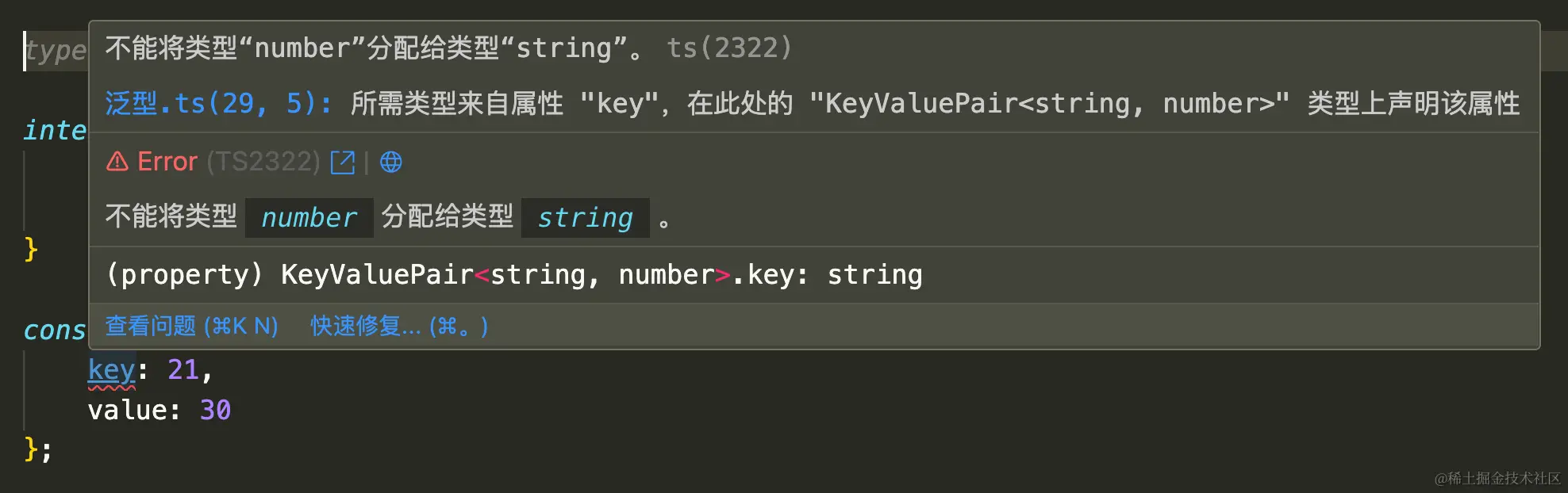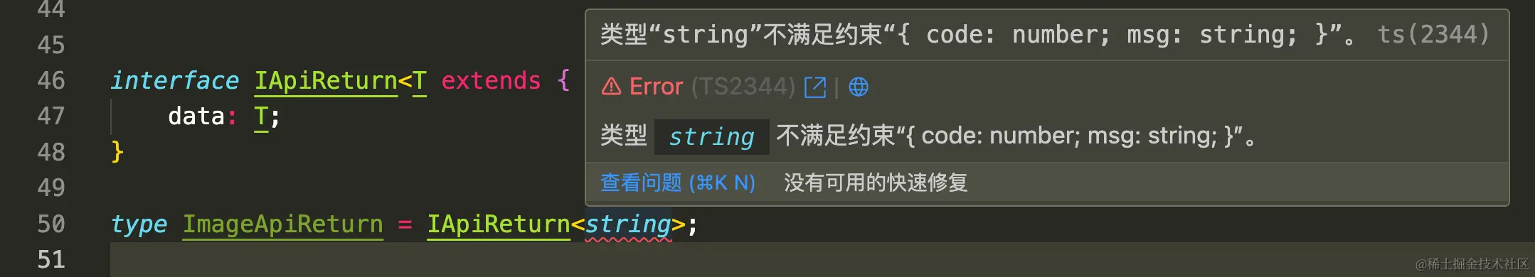 如果我们传递的类型不满足约束条件时, TS 就会在运行的阶段会提示我们,这样可以避免我们产生后续的 bug