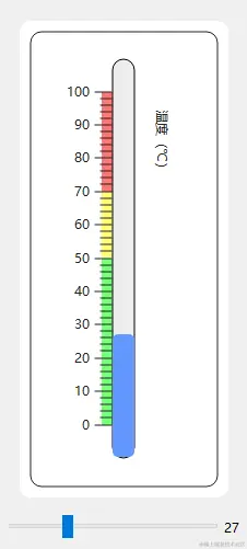刻度分为长分段刻度与短指示刻度,文字标签跟随长分段刻度同一时机绘制;分段警告标签,即图中绿色,黄色与红色区域,每段指定上限与下限百分比位置,以及对应颜色,可根据总有效刻度高度计算各分段的具体高度与坐标