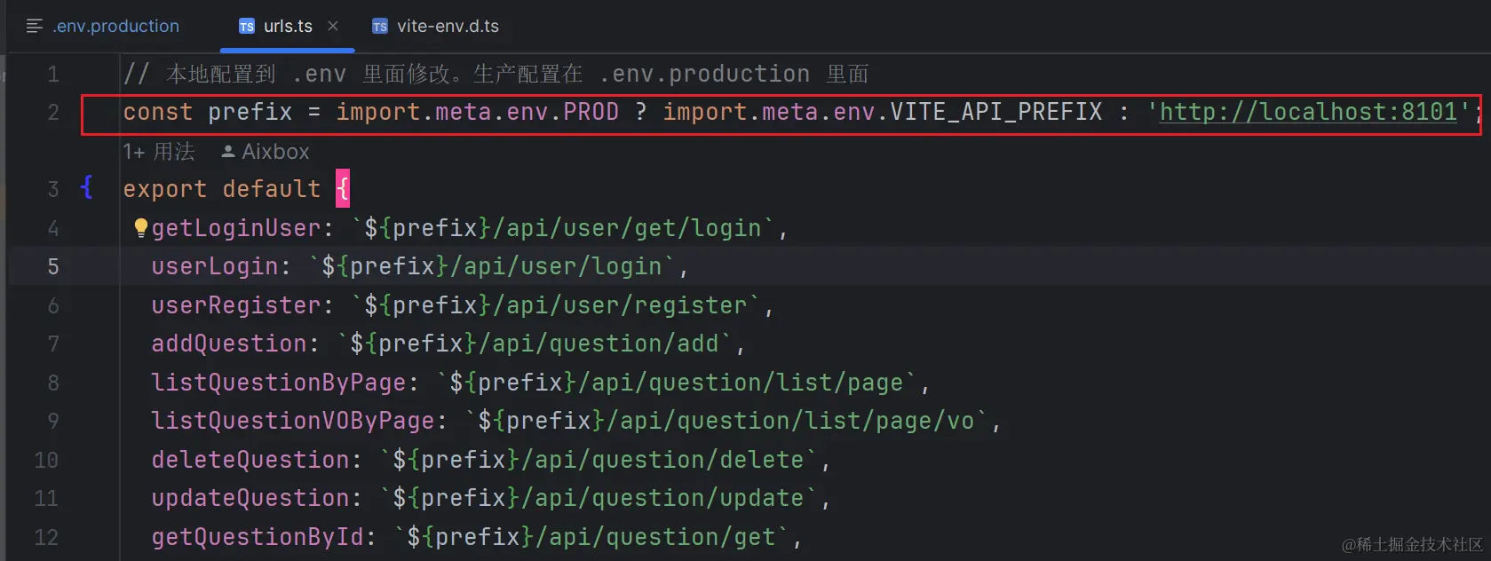 修改生产环境的配置,可以在项目中使用 import.meta.env.PROD import.meta.env.VITE_API_PREFIX判断当前环境使用什么配置。使用npm run build构建的项目在nginx运行时使用的url就是生产环境的url