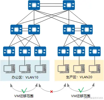 传统的三层网络架构限制了虚拟机的动态迁移范围,如下图所示,迁移只能在一个较小的局部范围内进行,应用受到了极大的限制。