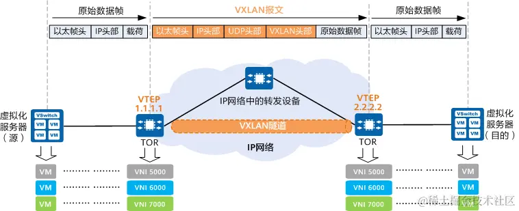 VTEP(VXLAN Tunnel Endpoints,VXLAN隧道端点)是VXLAN网络的边缘设备,是VXLAN隧道的起点和终点,源服务器发出的原始数据帧,在VTEP上被封装成VXLAN格式的报文,并在IP网络中传递到另外一个VTEP上,并经过解封转还原出原始的数据帧,最后转发给目的服务器。