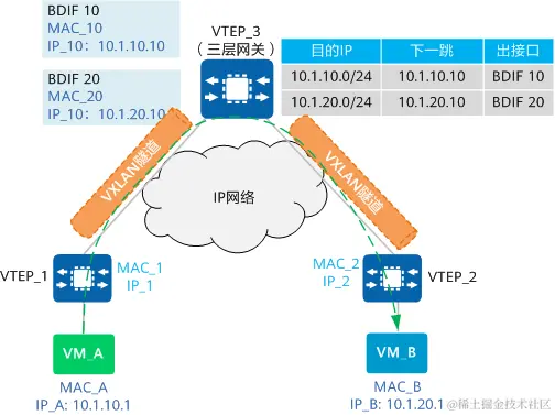 - VTEP_3收到VXLAN报文后进行解封装,发现目的MAC是三层网关接口BDIF的MAC地址MAC_10,而目的IP地址为IP_B(10.1.20.1),因此需要进行三层转发。